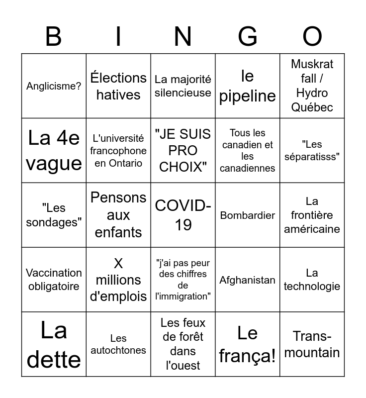 This bingo card has a free space and 34 words: L'Outaouais?, Le frança!, La constitution <3, "L'homme de la situation", Vaccination obligatoire, L'université francophone en Ontario, Muskrat fall / Hydro Québec, La dette, Élections hatives, Compétances provinciales / fédérales, "JE SUIS PRO CHOIX", La majorité silencieuse, Passport vaccinal, Le pétrole sale, Bombardier, "Les séparatisss", Les autochtones, "Les sondages", X millions d'emplois, Afghanistan, "j'ai pas peur des chiffres de l'immigration", Stephen harper/Andrew Sheer, Anglicisme?, La frontière américaine, Les feux de forêt dans l'ouest, Trans-mountain, le pipeline, Les armes à feux, Tous les canadien et les canadiennes, La 4e vague, 中国, Pensons aux enfants, La technologie and Les anti-vax.