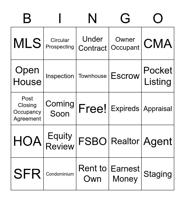This bingo card has a free space and 24 words: Equity Review, Condominium, Townhouse, SFR, CMA, MLS, Open House, Circular Prospecting, Expireds, FSBO, Escrow, Post Closing Occupancy Agreement, Realtor, Agent, Inspection, Earnest Money, Appraisal, Under Contract, Pocket Listing, Coming Soon, Staging, HOA, Owner Occupant and Rent to Own.