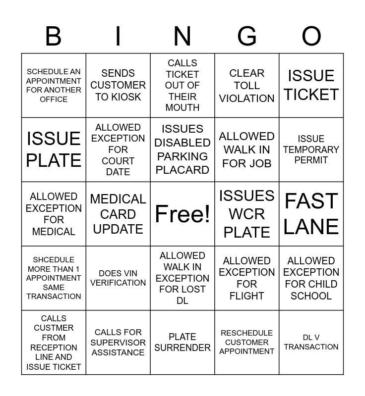 This bingo card has a free space and 24 words: DOES VIN VERIFICATION, CALLS FOR SUPERVISOR ASSISTANCE, ISSUES DISABLED PARKING PLACARD, CALLS CUSTMER FROM RECEPTION LINE AND ISSUE TICKET, ISSUE TICKET, SCHEDULE AN APPOINTMENT FOR ANOTHER OFFICE, ISSUE PLATE, SENDS CUSTOMER TO KIOSK, ISSUES WCR PLATE, ALLOWED WALK IN EXCEPTION FOR LOST DL, ALLOWED WALK IN FOR JOB, ALLOWED EXCEPTION FOR MEDICAL, ALLOWED EXCEPTION FOR FLIGHT, ALLOWED EXCEPTION FOR CHILD SCHOOL, ALLOWED EXCEPTION FOR COURT DATE, RESCHEDULE CUSTOMER APPOINTMENT, FAST LANE, CALLS TICKET OUT OF THEIR MOUTH, ISSUE TEMPORARY PERMIT, MEDICAL CARD UPDATE, DL V TRANSACTION, SHCEDULE MORE THAN 1 APPOINTMENT SAME TRANSACTION, CLEAR TOLL VIOLATION and PLATE SURRENDER.