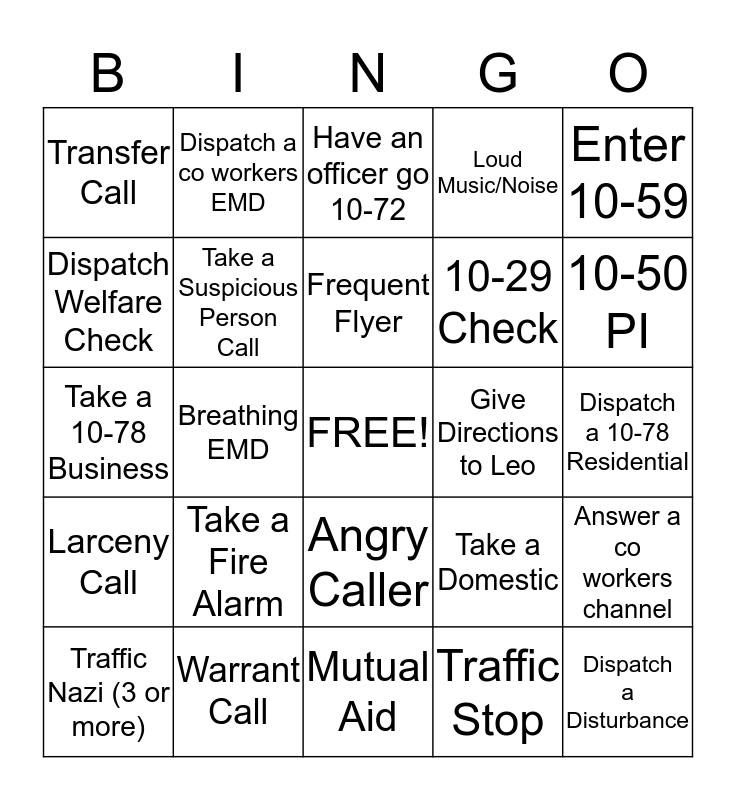 This bingo card has a free space and 24 words: Take a Fire Alarm, Warrant Call, Frequent Flyer, Traffic Nazi (3 or more), Enter 10-59, Transfer Call, Dispatch Welfare Check, Dispatch a co workers EMD, Give Directions to Leo, Angry Caller, 10-29 Check, Take a 10-78 Business, Take a Domestic, Answer a co workers channel, Take a Suspicious Person Call, Traffic Stop, Dispatch a 10-78 Residential, Have an officer go 10-72, 10-50 PI, Breathing EMD, Dispatch a Disturbance, Larceny Call, Loud Music/Noise and Mutual Aid.