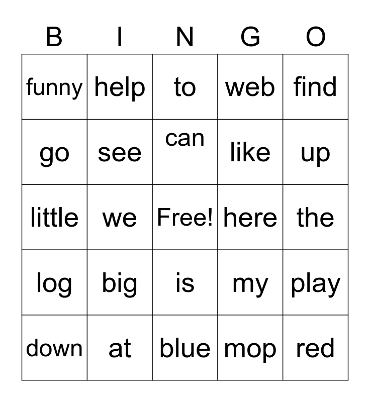 This bingo card has a free space and 25 words: big, blue, can, down, find, funny, go, help, here, is, like, little, my, play, see, said, the, to, up, we, red, at, log, web and mop.