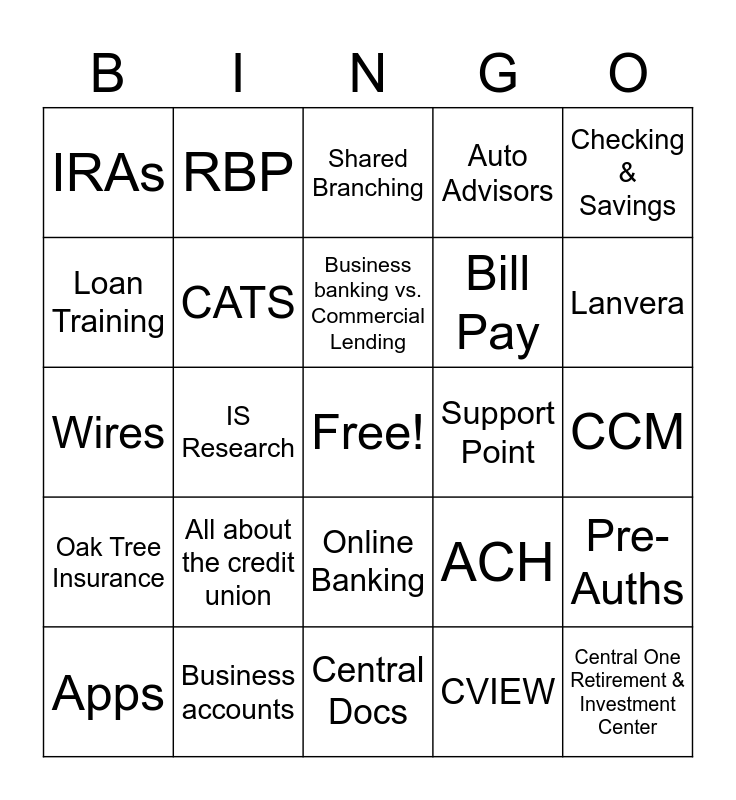 This bingo card has a free space and 24 words: All about the credit union, Business accounts, Business banking vs. Commercial Lending, Apps, Checking & Savings, IRAs, Loan Training, RBP, Support Point, Online Banking, Bill Pay, Wires, ACH, Pre-Auths, CATS, CVIEW, CCM, Shared Branching, Lanvera, IS Research, Central One Retirement & Investment Center, Oak Tree Insurance, Auto Advisors and Central Docs.