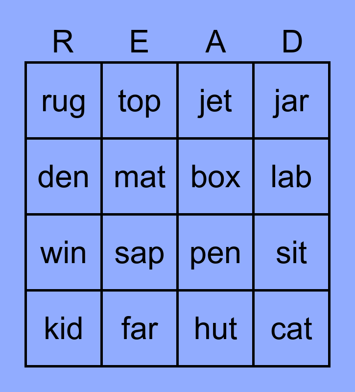 This bingo card has 18 words: sap, cat, jet, rug, pen, jar, kid, top, lab, win, hut, den, sit, mat, box, lip, far and log.