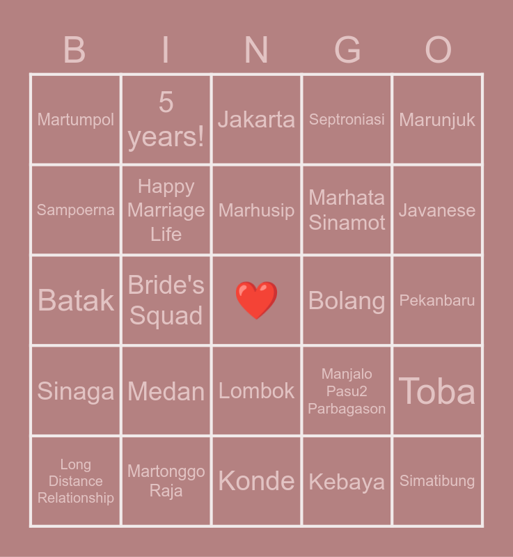 This bingo card has a free space and 24 words: Long Distance Relationship, Medan, Marhusip, Kebaya, Marunjuk, Martumpol, 5 years!, Jakarta, Bolang, Pekanbaru, Batak, Happy Marriage Life, Manjalo Pasu2 Parbagason, Toba, Sampoerna, Martonggo Raja, Konde, Septroniasi, Javanese, Sinaga, Bride's Squad, Lombok, Marhata Sinamot and Simatibung.