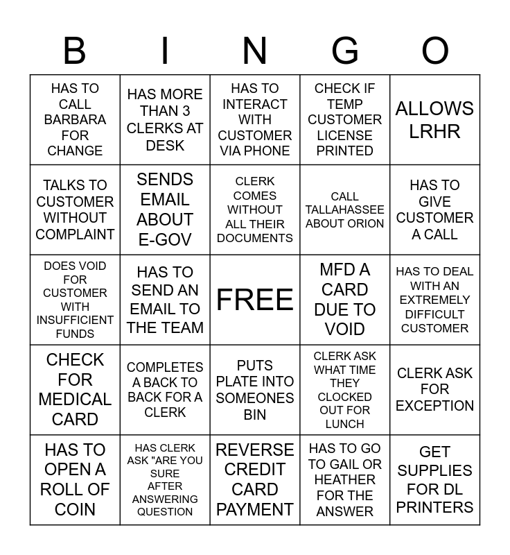This bingo card has a free space and 24 words: COMPLETES A BACK TO BACK FOR A CLERK, HAS CLERK ASK "ARE YOU SURE AFTER ANSWERING QUESTION, CLERK COMES WITHOUT ALL THEIR DOCUMENTS, HAS TO OPEN A ROLL OF COIN, ALLOWS LRHR, HAS TO CALL BARBARA FOR CHANGE, TALKS TO CUSTOMER WITHOUT COMPLAINT, HAS MORE THAN 3 CLERKS AT DESK, MFD A CARD DUE TO VOID, PUTS PLATE INTO SOMEONES BIN, CALL TALLAHASSEE ABOUT ORION, DOES VOID FOR CUSTOMER WITH INSUFFICIENT FUNDS, CLERK ASK WHAT TIME THEY CLOCKED OUT FOR LUNCH, CLERK ASK FOR EXCEPTION, SENDS EMAIL ABOUT E-GOV, HAS TO GO TO GAIL OR HEATHER FOR THE ANSWER, HAS TO DEAL WITH AN EXTREMELY DIFFICULT CUSTOMER, HAS TO INTERACT WITH CUSTOMER VIA PHONE, HAS TO GIVE CUSTOMER A CALL, HAS TO SEND AN EMAIL TO THE TEAM, GET SUPPLIES FOR DL PRINTERS, CHECK FOR MEDICAL CARD, CHECK IF TEMP CUSTOMER LICENSE PRINTED and REVERSE CREDIT CARD PAYMENT.