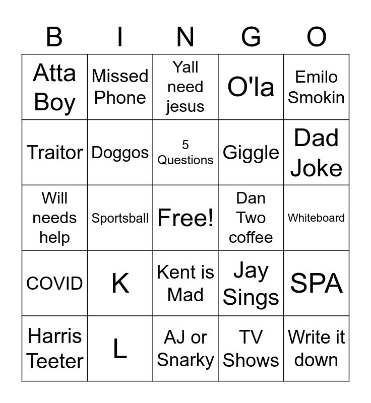 This bingo card has a free space and 24 words: K, L, 5 Questions, Harris Teeter, Emilo Smokin, Atta Boy, Traitor, Missed Phone, Dan Two coffee, Kent is Mad, Giggle, Will needs help, Jay Sings, SPA, Doggos, TV Shows, Whiteboard, Yall need jesus, Dad Joke, Sportsball, Write it down, COVID, O'la and AJ or Snarky.