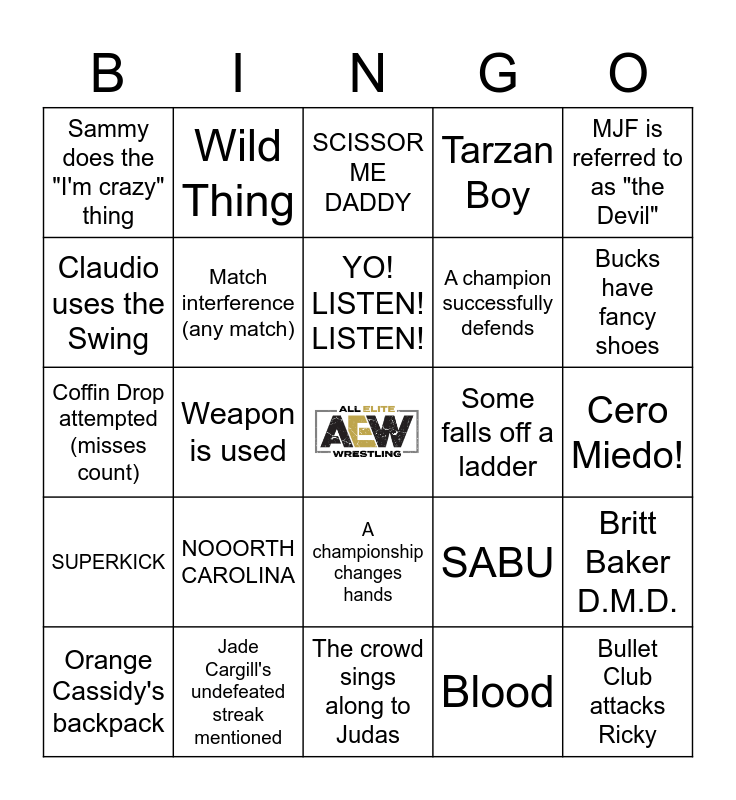This bingo card has a free space and 24 words: NOOORTH CAROLINA, Jade Cargill's undefeated streak mentioned, YO! LISTEN! LISTEN!, Orange Cassidy's backpack, MJF is referred to as "the Devil", Sammy does the "I'm crazy" thing, Claudio uses the Swing, Wild Thing, Some falls off a ladder, A championship changes hands, A champion successfully defends, Coffin Drop attempted (misses count), SABU, Britt Baker D.M.D., Match interference (any match), Blood, Cero Miedo!, SCISSOR ME DADDY, Bucks have fancy shoes, Weapon is used, Bullet Club attacks Ricky, SUPERKICK, Tarzan Boy and The crowd sings along to Judas.