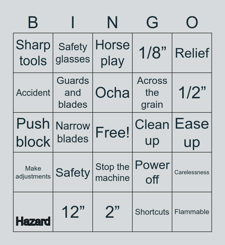 This bingo card has a free space and 24 words: Hazard, Safety, Ocha, Shortcuts, Relief, Sharp tools, Safety glasses, Horse play, Clean up, Ease up, Push block, Guards and blades, Power off, Carelessness, Accident, 12”, 2”, 1/8”, 1/2”, Make adjustments, Narrow blades, Stop the machine, Across the grain and Flammable.