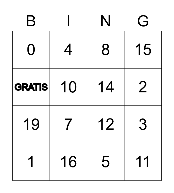 This bingo card has 16 words: 16, 3, 8, 0, 19, 4, 12, 5, GRATIS, 10, 1, 15, 7, 2, 14 and 11.