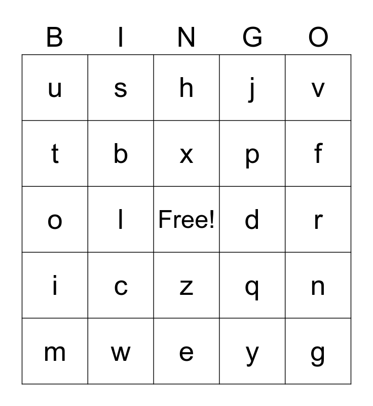 This bingo card has a free space and 26 words: z, y, x, w, v, u, t, s, r, q, p, o, n, m, l, k, j, i, h, g, f, e, d, c, b and a.