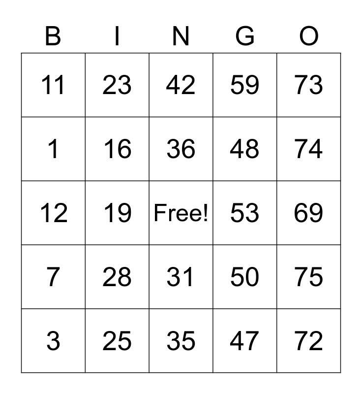 This bingo card has a free space and 24 words: 3, 28, 36, 47, 73, 11, 23, 42, 53, 69, 12, 16, 50, 75, 1, 25, 35, 59, 74, 7, 19, 31, 48 and 72.