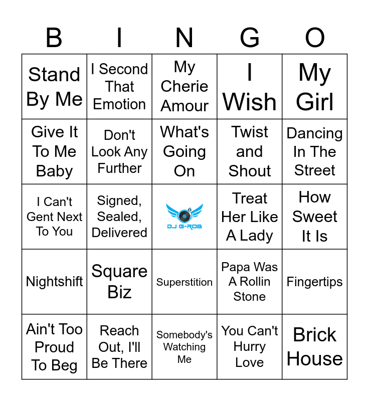 This bingo card has a free space and 39 words: Got To Be There, Just My Imagination, ABC, Don't Look Any Further, Ain't Too Proud To Beg, Superstition, What's Going On, Where Did Our Love Go, My Girl, Nightshift, Signed, Sealed, Delivered, I Wish, Brick House, How Sweet It Is, Treat Her Like A Lady, Square Biz, Please Mr. Postman, Stand By Me, We Are Family, Papa Was A Rollin Stone, Give It To Me Baby, Somebody's Watching Me, Twist and Shout, Dancing In The Street, I Can't Help Myself, Ooo Baby Baby, Let It Whip, Easy, My Guy, I Second That Emotion, I Heard It Through The Grapevine, Let's Get It On, My Cherie Amour, Reach Out, I'll Be There, You Can't Hurry Love, Do You Love Me, Fingertips, I Can't Gent Next To You and This Old Heart Of Mine.