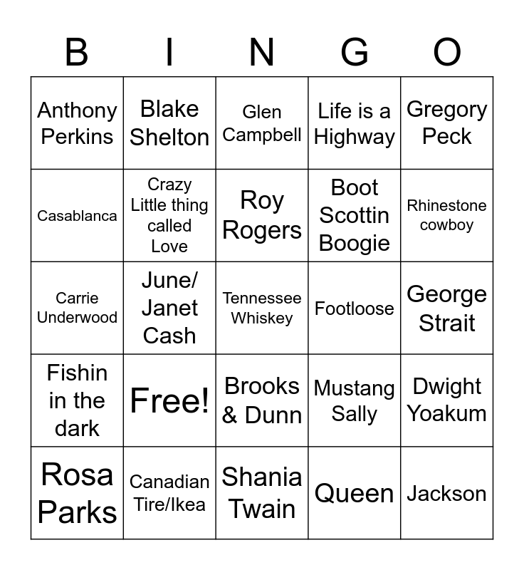 This bingo card has a free space and 24 words: Free!, Canadian Tire/Ikea, Roy Rogers, Rosa Parks, Gregory Peck, Anthony Perkins, Casablanca, Blake Shelton, Footloose, Brooks & Dunn, Boot Scottin Boogie, Carrie Underwood, Mustang Sally, Dwight Yoakum, Crazy Little thing called Love, Queen, George Strait, Glen Campbell, Rhinestone cowboy, June/ Janet Cash, Jackson, Fishin in the dark, Life is a Highway and Shania Twain.