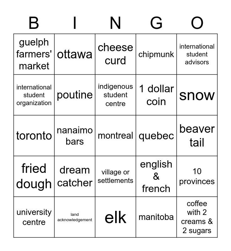 This bingo card has a free space and 24 words: dream catcher, land acknowledgement, indigenous student centre, university centre, international student advisors, guelph farmers' market, international student organization, ottawa, quebec, village or settlements, 1 dollar coin, toronto, english & french, 10 provinces, poutine, manitoba, beaver tail, cheese curd, snow, nanaimo bars, coffee with 2 creams & 2 sugars, fried dough, chipmunk and elk.