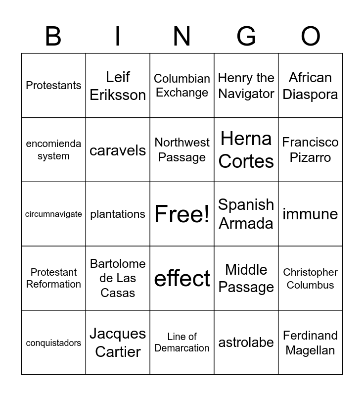 This bingo card has a free space and 28 words: Christopher Columbus, Moctezuna II, Herna Cortes, astrolabe, encomienda system, Columbian Exchange, Leif Eriksson, Protestant Reformation, Spanish Armada, conquistadors, circumnavigate, Henry the Navigator, Jacques Cartier, Line of Demarcation, Francisco Pizarro, Treaty of Tordesillas, Bartolome de Las Casas, caravels, Northwest Passage, effect, Protestants, charter, Ferdinand Magellan, plantations, immune, Middle Passage, African Diaspora and structure.