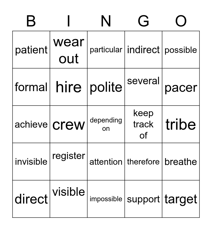 This bingo card has a free space and 24 words: register, visible, polite, direct, possible, patient, formal, wear out, keep track of, attention, several, achieve, therefore, breathe, hire, support, tribe, particular, pacer, crew, target, invisible, indirect and impossible.