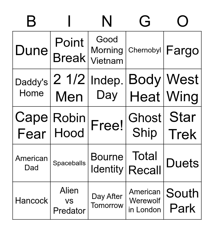 This bingo card has a free space and 59 words: Garfunkel & Oats, Alien vs Predator, American Beauty, American Dad, American Werewolf in London, Apollo 13, 2 1/2 Men, Ally McBeal, Body Heat, BSG, Chernobyl, SOA, Daddy's Home, Aliens, Die Another Day, Dune, South Park, Fargo, Friends, Indep. Day, Ghost Ship, Good Morning Vietnam, Hancock, Duets, John Belushi, John Wick, Jurassic World, Ladyhawke, West Wing, Major Payne, Top Gun, Once Upon a Time, No Way Out, Bill Burr, Point Break, Poltergeist, First Blood, Robin Hood, Rush Hour 2, Cape Fear, Johnny Quest, Spaceballs, Star Trek, Captain America, Super 8, Terminator VS Jesus, Test T Shields, The Birdcage, Bourne Identity, Day After Tomorrow, The Hangover, The Hero, The Pips, Predator 2023, Iron Man, Total Recall, SNL, WKRP and Gemini Man.
