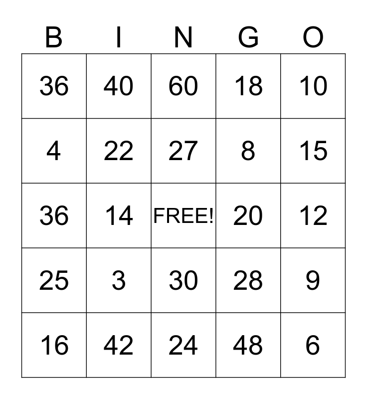 This bingo card has a free space and 24 words: 3, 42, 27, 16, 10, 36, 4, 40, 20, 30, 8, 36, 28, 9, 22, 48, 12, 60, 15, 14, 6, 25, 18 and 24.