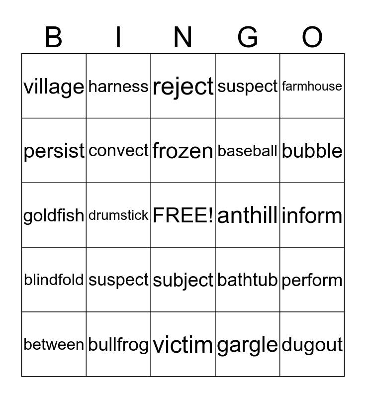 This bingo card has a free space and 24 words: suspect, bullfrog, frozen, between, farmhouse, village, persist, harness, anthill, subject, baseball, goldfish, bathtub, perform, convect, gargle, inform, reject, bubble, drumstick, dugout, blindfold, suspect and victim.