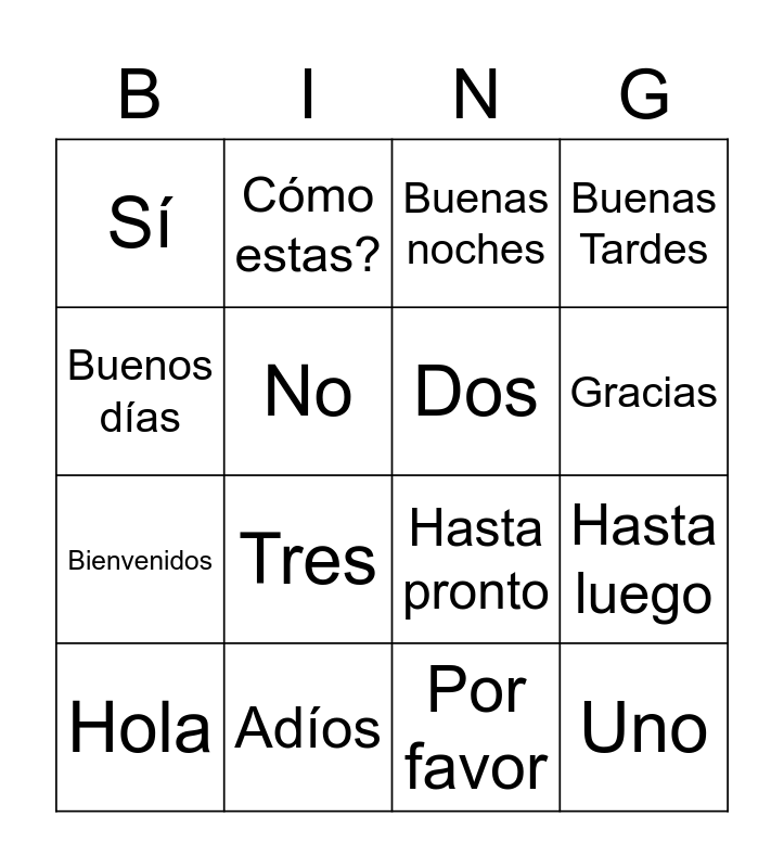 This bingo card has 16 words: Hola, Adíos, Buenas noches, Buenas Tardes, Buenos días, Cómo estas?, Hasta pronto, Hasta luego, Sí, No, Por favor, Gracias, Bienvenidos, Tres, Dos and Uno.