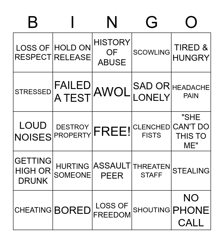 This bingo card has a free space and 30 words: BORED, BEING PUT DOWN, DESTROY PROPERTY, HEART POUNDING, LOSS OF RESPECT, HISTORY OF ABUSE, FAILED A TEST, ASSAULT PEER, CLENCHED FISTS, LOSS OF FREEDOM, "SHE CAN'T DO THIS TO ME", NO PHONE CALL, SHOUTING, GUILT OR SHAME, HEADACHE PAIN, BEING TOLD "NO", THREATEN STAFF, GETTING HIGH OR DRUNK, HURTING SOMEONE, TIRED & HUNGRY, LOUD NOISES, THROWING FOOD, HOLD ON RELEASE, SAD OR LONELY, STRESSED, SCOWLING, STEALING, CHEATING, AWOL and CURSING.