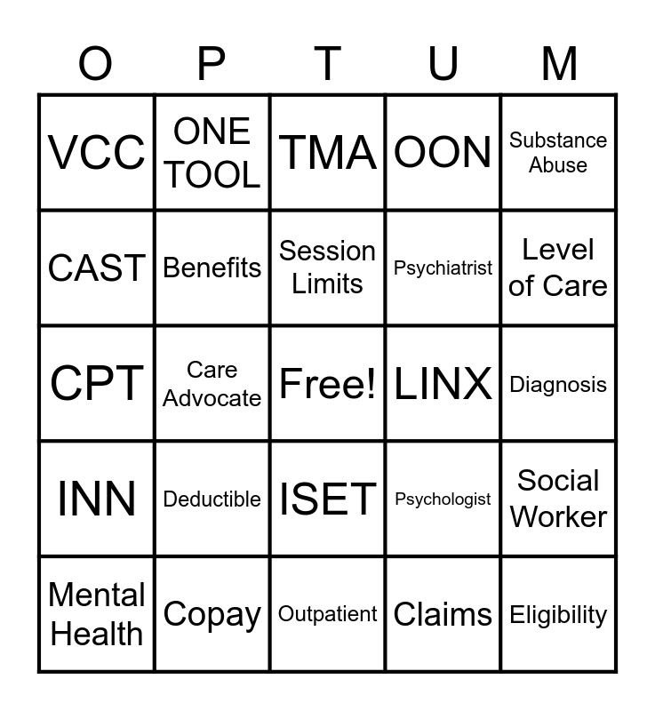 This bingo card has a free space and 24 words: Deductible, Copay, Session Limits, Mental Health, Substance Abuse, VCC, CAST, ONE TOOL, LINX, ISET, Psychiatrist, CPT, Psychologist, Social Worker, Benefits, Claims, Diagnosis, TMA, Level of Care, Care Advocate, Eligibility, INN, OON and Outpatient.