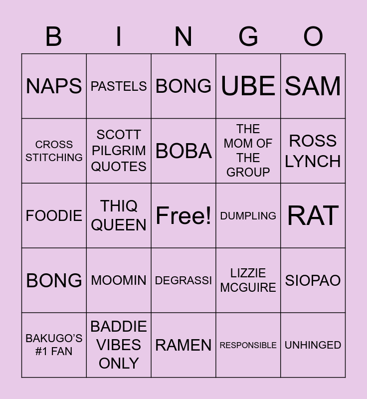 This bingo card has a free space and 26 words: DEGRASSI, RESPONSIBLE, BOBA, BADDIE VIBES ONLY, SAM, NAPS, CROSS STITCHING, PASTELS, RAT, LIZZIE MCGUIRE, THE MOM OF THE GROUP, FOODIE, SIOPAO, BAKUGO’S #1 FAN, THIQ QUEEN, COOKING, UBE, BONG, BONG, UNHINGED, ROSS LYNCH, RAMEN, DUMPLING, MOOMIN, SCOTT PILGRIM QUOTES and CHISMOSA.