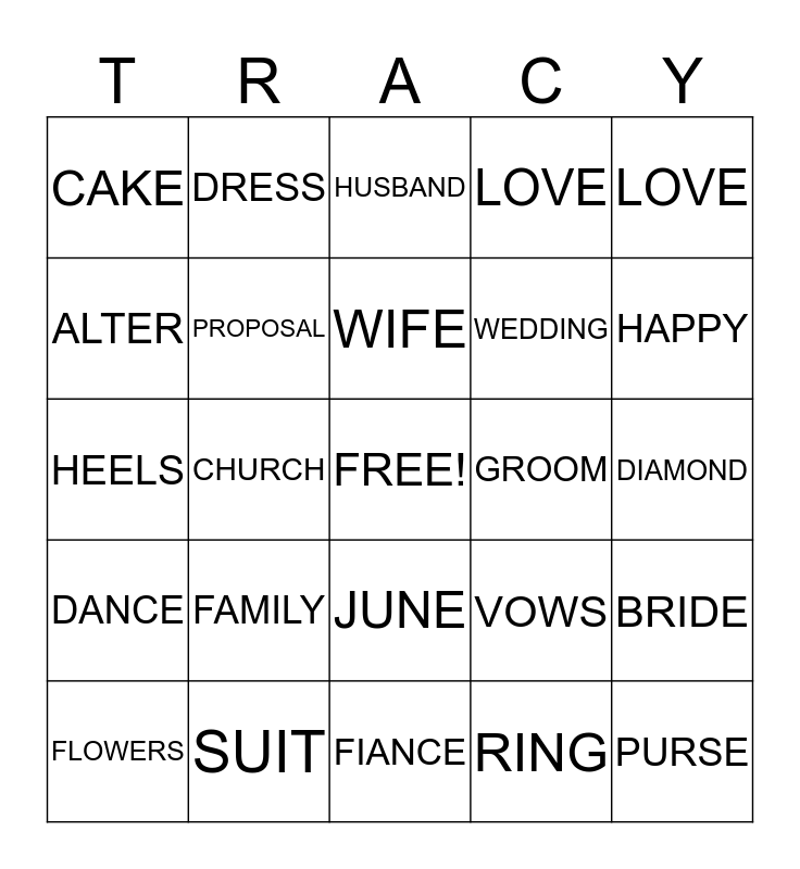 This bingo card has a free space and 24 words: FAMILY, SUIT, WIFE, FLOWERS, LOVE, CAKE, ALTER, DRESS, GROOM, JUNE, WEDDING, HEELS, VOWS, BRIDE, PROPOSAL, RING, DIAMOND, HUSBAND, HAPPY, CHURCH, PURSE, DANCE, LOVE and FIANCE.