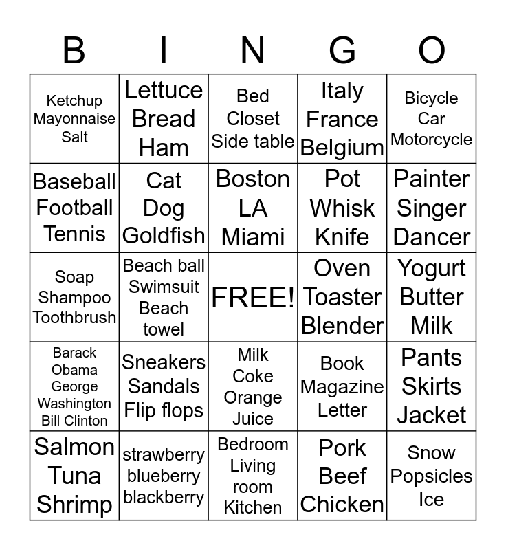 This bingo card has a free space and 24 words: Sneakers Sandals Flip flops, strawberry blueberry blackberry, Boston LA Miami, Salmon Tuna Shrimp, Bicycle Car Motorcycle, Ketchup Mayonnaise Salt, Baseball Football Tennis, Lettuce Bread Ham, Oven Toaster Blender, Milk Coke Orange Juice, Pot Whisk Knife, Soap Shampoo Toothbrush, Book Magazine Letter, Pants Skirts Jacket, Cat Dog Goldfish, Pork Beef Chicken, Yogurt Butter Milk, Bed Closet Side table, Painter Singer Dancer, Beach ball Swimsuit Beach towel, Snow Popsicles Ice, Barack Obama George Washington Bill Clinton, Italy France Belgium and Bedroom Living room Kitchen.