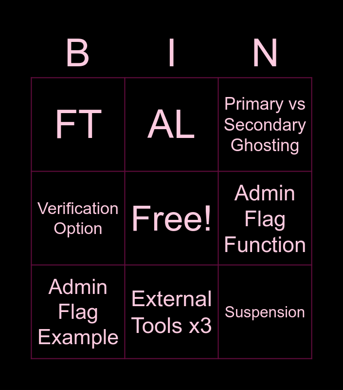 This bingo card has a free space and 8 words: Admin Flag Function, Primary vs Secondary Ghosting, AL, Admin Flag Example, FT, Suspension, Verification Option and External Tools x3.