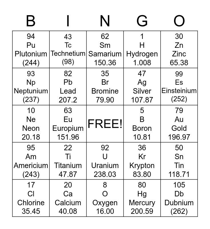 This bingo card has a free space and 24 words: 22 Ti Titanium 47.87, 20 Ca Calcium 40.08, 35 Br Bromine 79.90, 17 Cl Chlorine 35.45, 30 Zn Zinc 65.38, 94 Pu Plutonium (244), 93 Np Neptunium (237), 43 Tc Technetium (98), 5 B Boron 10.81, 92 U Uranium 238.03, 47 Ag Silver 107.87, 10 Ne Neon 20.18, 36 Kr Krypton 83.80, 50 Sn Tin 118.71, 82 Pb Lead 207.2, 80 Hg Mercury 200.59, 79 Au Gold 196.97, 62 Sm Samarium 150.36, 99 Es Einsteinium (252), 63 Eu Europium 151.96, 105 Db Dubnium (262), 95 Am Americium (243), 1 H Hydrogen 1.008 and 8 O Oxygen 16.00.