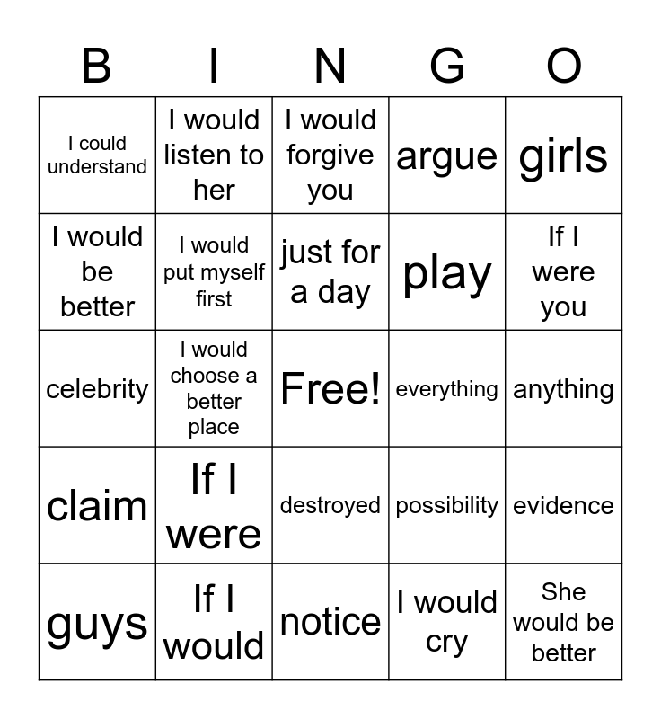 This bingo card has a free space and 24 words: If I were, If I would, just for a day, guys, girls, I could understand, I would be better, I would listen to her, everything, destroyed, play, celebrity, possibility, evidence, I would put myself first, I would cry, anything, I would forgive you, If I were you, I would choose a better place, She would be better, claim, argue and notice.