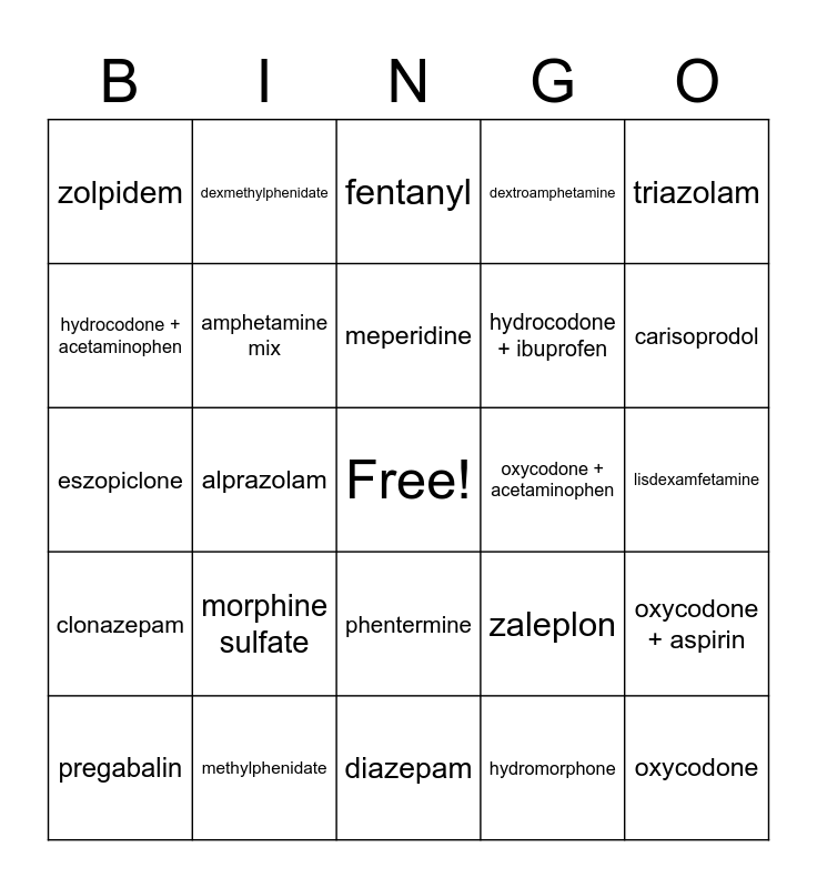 This bingo card has a free space and 24 words: morphine sulfate, methylphenidate, meperidine, pregabalin, triazolam, zolpidem, hydrocodone + acetaminophen, dexmethylphenidate, oxycodone + acetaminophen, phentermine, hydrocodone + ibuprofen, eszopiclone, zaleplon, oxycodone + aspirin, amphetamine mix, hydromorphone, lisdexamfetamine, fentanyl, carisoprodol, alprazolam, oxycodone, clonazepam, dextroamphetamine and diazepam.