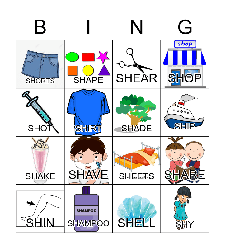 This bingo card has 25 images and 25 words: SHOES, SHEEP, SHIP, SHELVES, SHOT, SHORTS, SHIRT, SHAPE, SHAMPOO, CHEF, SHAKE, SHEETS, SHINY, SHOWER, SHADE, SHOW, SHELL, SHEAR, SHAVE, SHARE, SHIN, SHED, SHY, SHOP and SHOCK.