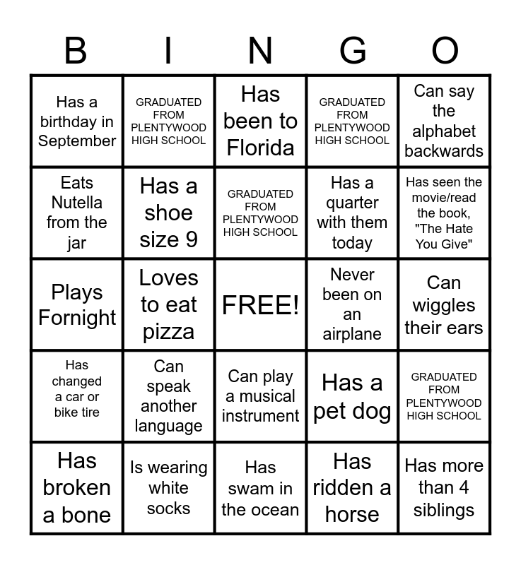 This bingo card has 1 images, a free space and 29 words: Has broken a bone, Is left handed, Loves to eat pizza, Has the same number of siblings as you, Has a birthday in September, Has been to Florida, Has a shoe size 9, Can speak another language, Never been on an airplane, Is wearing white socks, Can wiggles their ears, Has more than 4 siblings, Has swam in the ocean, Has ridden a horse, Has seen the movie/read the book, "The Hate You Give", Can do 'the rock' eyebrow lift, Can play a musical instrument, Has changed a car or bike tire, Can say the alphabet backwards, Plays Fornight, Has a pet dog, Has been to more than 1 school, Has a quarter with them today, Eats Nutella from the jar, GRADUATED FROM PLENTYWOOD HIGH SCHOOL, GRADUATED FROM PLENTYWOOD HIGH SCHOOL, GRADUATED FROM PLENTYWOOD HIGH SCHOOL, GRADUATED FROM PLENTYWOOD HIGH SCHOOL and GRADUATED FROM PLENTYWOOD HIGH SCHOOL.