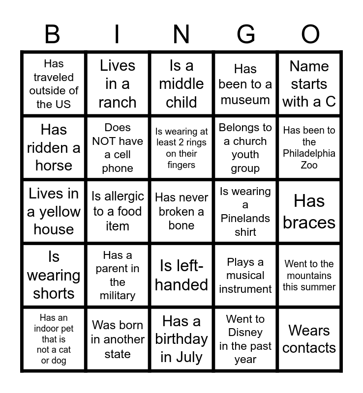 This bingo card has 25 words: Has a parent in the military, Has a birthday in July, Is wearing at least 2 rings on their fingers, Has an indoor pet that is not a cat or dog, Name starts with a C, Has traveled outside of the US, Has ridden a horse, Lives in a ranch, Is wearing a Pinelands shirt, Is left-handed, Belongs to a church youth group, Lives in a yellow house, Plays a musical instrument, Went to the mountains this summer, Does NOT have a cell phone, Wears contacts, Has braces, Is a middle child, Has been to the Philadelphia Zoo, Is allergic to a food item, Has never broken a bone, Was born in another state, Is wearing shorts, Has been to a museum and Went to Disney in the past year.