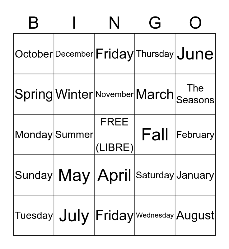 This bingo card has a free space and 24 words: May, July, November, Tuesday, June, October, Spring, December, Fall, April, March, Monday, Saturday, January, Winter, Wednesday, February, Friday, The Seasons, Summer, August, Sunday, Thursday and Friday.