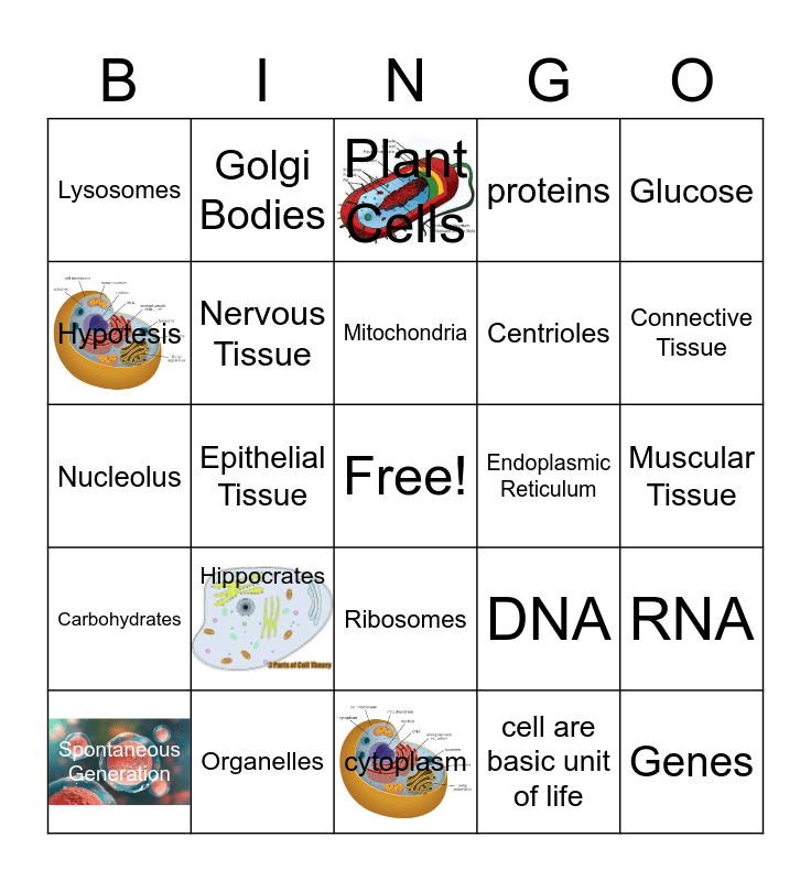 This bingo card has 5 images, a free space and 24 words: Hippocrates, Organelles, Mitochondria, Spontaneous Generation, Glucose, Lysosomes, Hypotesis, Golgi Bodies, Endoplasmic Reticulum, Ribosomes, Centrioles, Nucleolus, DNA, RNA, Nervous Tissue, cell are basic unit of life, Muscular Tissue, Plant Cells, Connective Tissue, Epithelial Tissue, Genes, Carbohydrates, proteins and cytoplasm.
