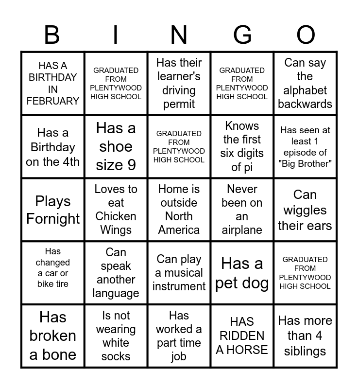 This bingo card has 1 images, a free space and 29 words: Has broken a bone, Left Handed, Loves to eat Chicken Wings, Has the same number of siblings as you, HAS A BIRTHDAY IN FEBRUARY, Has their learner's driving permit, Has a shoe size 9, Can speak another language, Never been on an airplane, Is not wearing white socks, Can wiggles their ears, Has more than 4 siblings, Has worked a part time job, HAS RIDDEN A HORSE, Has seen at least 1 episode of "Big Brother", Can do 'the rock' eyebrow lift, Can play a musical instrument, Has changed a car or bike tire, Can say the alphabet backwards, Plays Fornight, Has a pet dog, Did not attend Darlington Middle School, Knows the first six digits of pi, Has a Birthday on the 4th, GRADUATED FROM PLENTYWOOD HIGH SCHOOL, GRADUATED FROM PLENTYWOOD HIGH SCHOOL, GRADUATED FROM PLENTYWOOD HIGH SCHOOL, GRADUATED FROM PLENTYWOOD HIGH SCHOOL and GRADUATED FROM PLENTYWOOD HIGH SCHOOL.