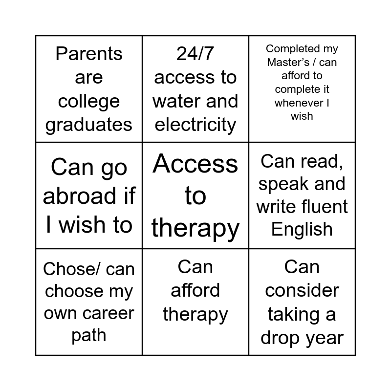 This bingo card has a free space and 8 words: Can read, speak and write fluent English, Completed my Master’s / can afford to complete it whenever I wish, 24/7 access to water and electricity, Chose/ can choose my own career path, Parents are college graduates, Can consider taking a drop year, Can go abroad if I wish to and Can afford therapy.