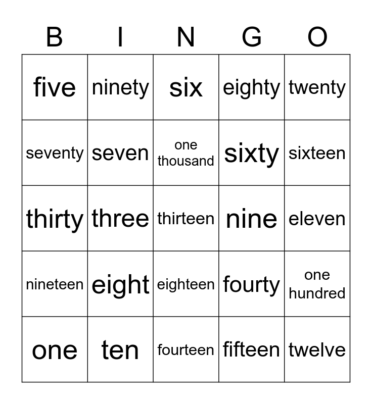 This bingo card has a free space and 29 words: one, two, three, four, five, six, seven, eight, nine, ten, eleven, twelve, fourteen, fifteen, sixteen, seventeen, eighteen, nineteen, twenty, thirty, fourty, fifty, sixty, seventy, eighty, ninety, one hundred, one thousand and one million.