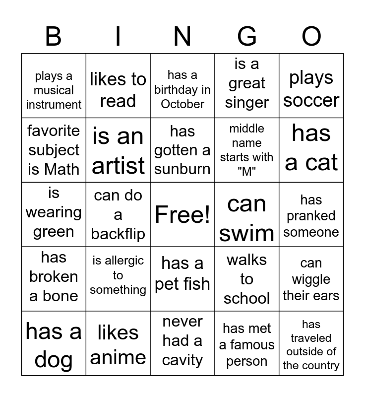 This bingo card has a free space and 44 words: is the youngest sibling, has traveled outside of the country, has fun colored hair, has a dog, loves to dance, has met a famous person, has a birthday in October, is an only child, plays soccer, likes anime, is a great singer, can swim, has a pet fish, is allergic to something, likes to cook, never had a cavity, has a birthday on a holiday, is wearing green, is the oldest sibling, has a cat, likes to read, wears glasses, speaks 2 or more languages, plays a musical instrument, has seen the same movie 5 or more times, has pranked someone, is afraid of spiders, can whistle, walks to school, has broken a bone, knows how to skate, can wiggle their ears, loves broccoli, has tried sushi, can do a backflip, has never left Massachusetts, has lived in another city, is a vegetarian/vegan, has gotten a sunburn, favorite subject is Math, middle name starts with "M", rode a horse, is an artist and likes salty more than sweet.