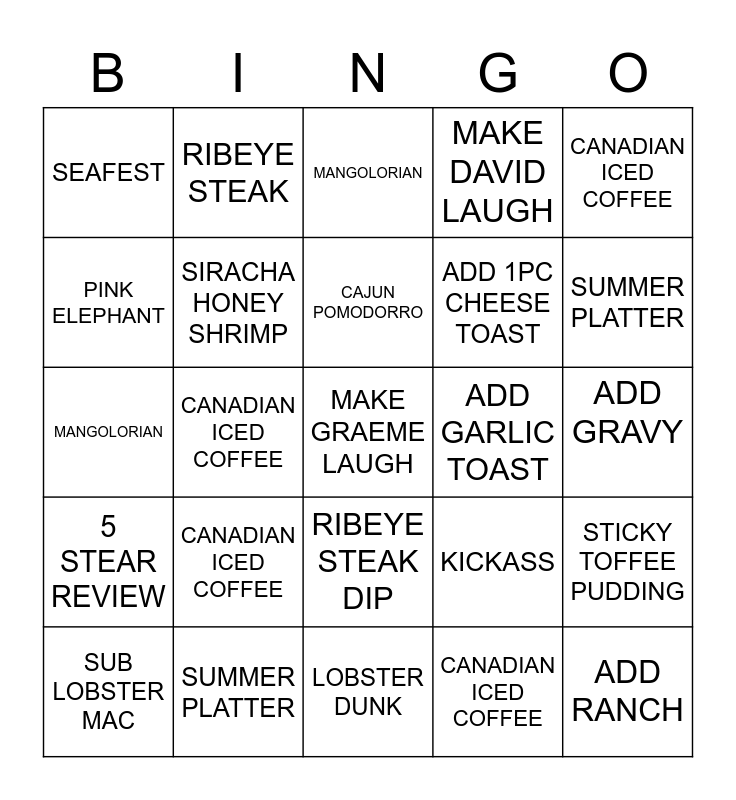 This bingo card has a free space and 24 words: CANADIAN ICED COFFEE, SUMMER PLATTER, CAJUN POMODORRO, SUB LOBSTER MAC, CANADIAN ICED COFFEE, SEAFEST, PINK ELEPHANT, RIBEYE STEAK, ADD GARLIC TOAST, RIBEYE STEAK DIP, ADD 1PC CHEESE TOAST, MANGOLORIAN, KICKASS, STICKY TOFFEE PUDDING, SIRACHA HONEY SHRIMP, CANADIAN ICED COFFEE, ADD GRAVY, MANGOLORIAN, SUMMER PLATTER, CANADIAN ICED COFFEE, ADD RANCH, 5 STEAR REVIEW, MAKE DAVID LAUGH and LOBSTER DUNK.