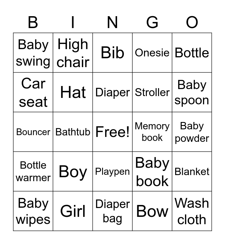 This bingo card has a free space and 24 words: Boy, Girl, Diaper, Baby wipes, Bottle, Baby swing, Car seat, High chair, Memory book, Playpen, Stroller, Bouncer, Baby book, Blanket, Hat, Bow, Baby powder, Bib, Baby spoon, Bathtub, Wash cloth, Bottle warmer, Onesie and Diaper bag.