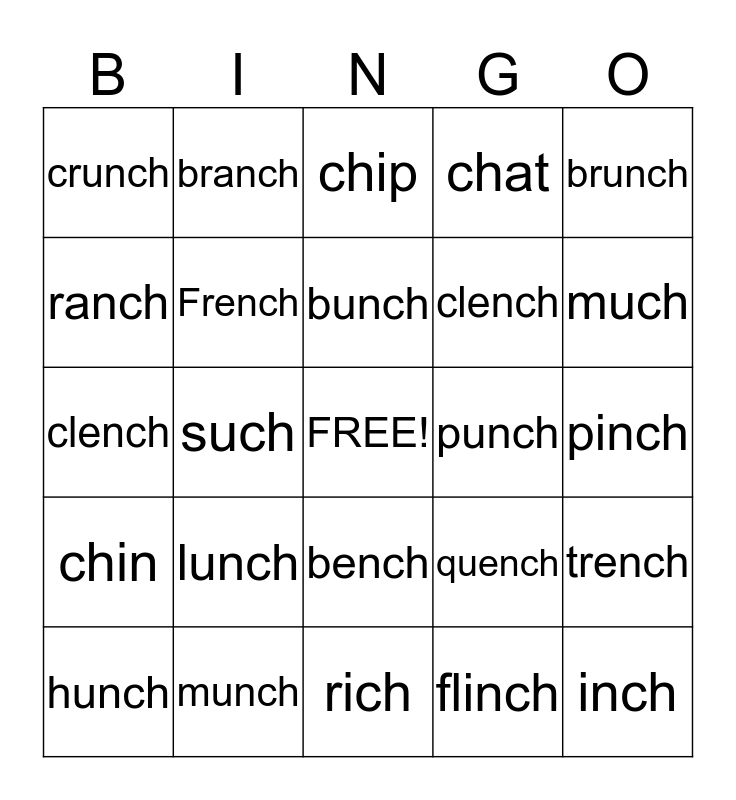 This bingo card has a free space and 24 words: lunch, munch, bunch, hunch, brunch, crunch, ranch, branch, punch, bench, clench, clench, quench, trench, French, flinch, pinch, chip, much, such, inch, chin, chat and rich.
