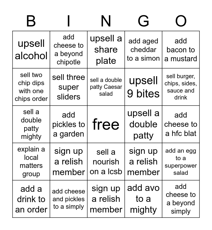 This bingo card has a free space and 24 words: sign up a relish member, add cheese and pickles to a simply, sell a double patty Caesar salad, add a drink to an order, add bacon to a mustard, upsell alcohol, sell two chip dips with one chips order, add cheese to a beyond chipotle, upsell a double patty, sell a nourish on a lcsb, upsell 9 bites, sell a double patty mighty, sign up a relish member, add an egg to a superpower salad, sell three super sliders, add avo to a mighty, add cheese to a hfc blat, upsell a share plate, sell burger, chips, sides, sauce and drink, add pickles to a garden, add cheese to a beyond simply, explain a local matters group, add aged cheddar to a simon and sign up a relish member.