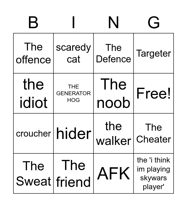 This bingo card has 17 words: AFK, The Sweat, The Defence, The offence, hider, Targeter, The Cheater, The noob, Free!, THE GENERATOR HOG, The friend, the walker, the idiot, scaredy cat, croucher, speedbridger and the 'i think im playing skywars player'.