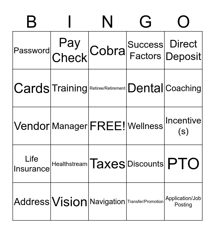 This bingo card has a free space and 51 words: Employee Relations, Application/Job Posting, Bonus, Navigation, Healthstream, Coverage, Pay Check, Enrollment, Cards, New/Re-Hire, Training, Success Factors, PTO, Discounts, EzAccess, FMLA/Non-FMLA, Retiree/Retirement, Wellness, AskHR, Direct Deposit, Manager, Transfer/Promotion, Password, Dental, Appeals/Grievance, Claims, Coaching, Arrears, Address, Cobra, Eligibility, Discount, Employee Action Form, Interview, LTD/STD, Vision, Reports, Kronos, Garnishment, Merit Increase, Incentive (s), Life Insurance, Insurance, Union, Employee Relations, Website, Vendor, Pharmacy, FSA/HRA, Taxes and Termination.