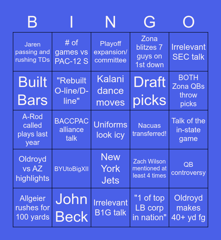 This bingo card has a free space and 24 words: BYUtoBigXII, John Beck, Kalani dance moves, Allgeier rushes for 100 yards, Irrelevant SEC talk, Jaren passing and rushing TDs, Built Bars, # of games vs PAC-12 S, Nacuas transferred!, New York Jets, Draft picks, A-Rod called plays last year, Zach Wilson mentioned at least 4 times, QB controversy, "Rebuilt O-line/D-line", "1 of top LB corp in nation", Talk of the in-state game, Playoff expansion/ committee, BOTH Zona QBs throw picks, BACCPAC alliance talk, Oldroyd makes 40+ yd fg, Oldroyd vs AZ highlights, Zona blitzes 7 guys on 1st down and Irrelevant B1G talk.