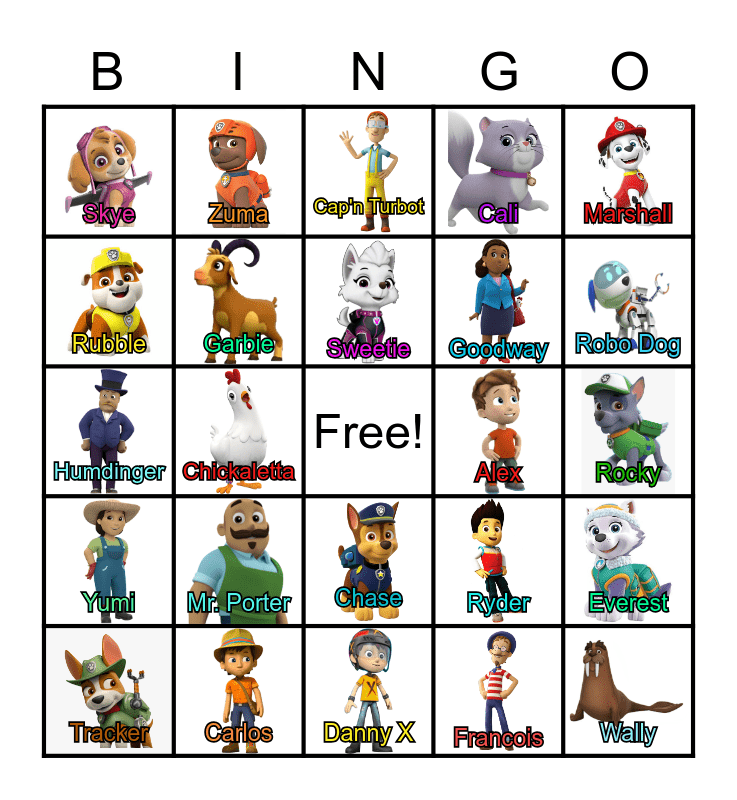 This bingo card has 26 images, a free space and 26 words: Chase, Francois, Sweetie, Carlos, Marshall, Skye, Rubble, Zuma, Rocky, Ryder, Goodway, Humdinger, Everest, Tracker, Chickaletta, Katie, Cali, Yumi, Cap'n Turbot, Wally, Robo Dog, Danny X, Alex, Mr. Porter, Garbie and Bettina.